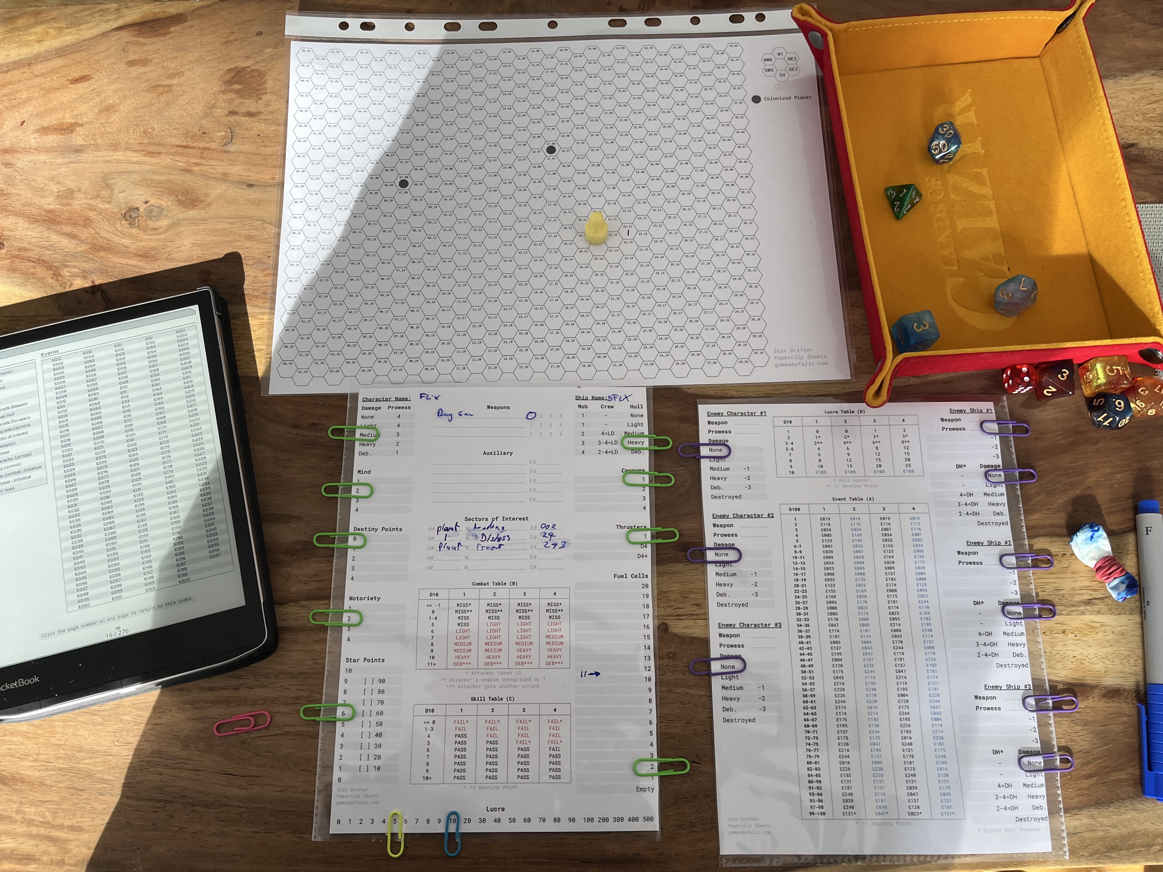Reworked character and map sheets that let you use paperclips, clipped around the pages, to track the various stats.
